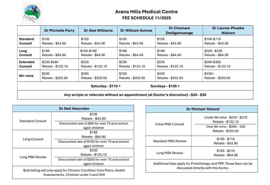 Private fees apply for all excisions, procedures, mental health treament plans, private vaccines, specialised injections, diagnostic testing, insurance reports and home visits.